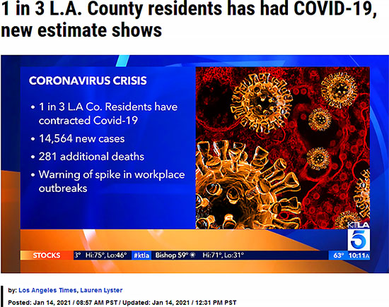 KTLA 5 Newsの記事によれば、ロサンゼルス・カウンティの1,000万人の住民のうち、これまでに300万人以上が新型コロナウイルスに感染しているとの事。