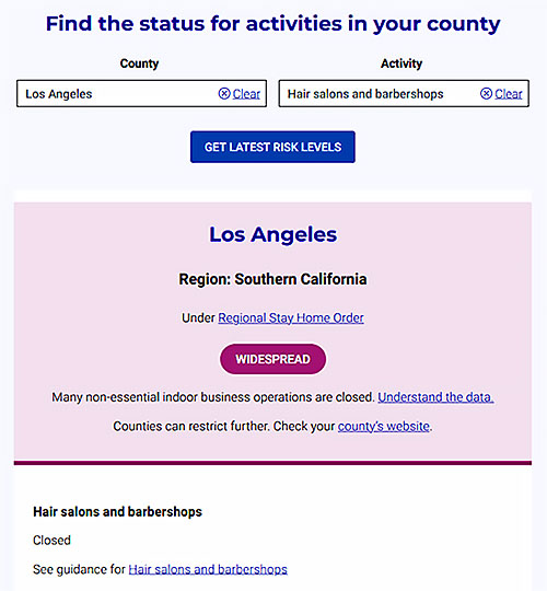 (上記COVID19.CA.GOVのリンクより、お住まいの地域の各アクティビティの状況を確認する事が出来ます。)