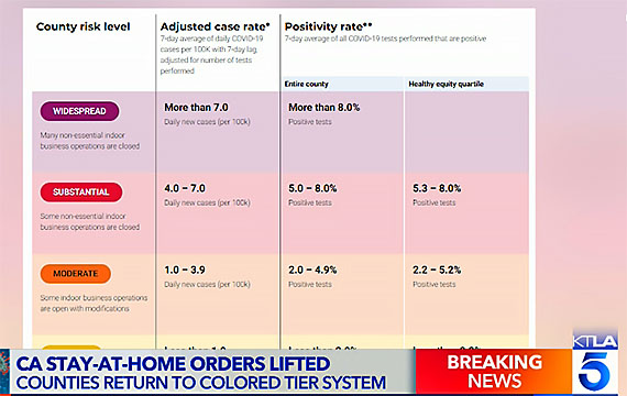 そしてStay at Home Orderの解除後においては、4段階の色分けによる「Colored Tier System」が再び実施される事となり、各カウンティごとに該当する段階のガイドラインに準じ経済活動を行う事になります。
