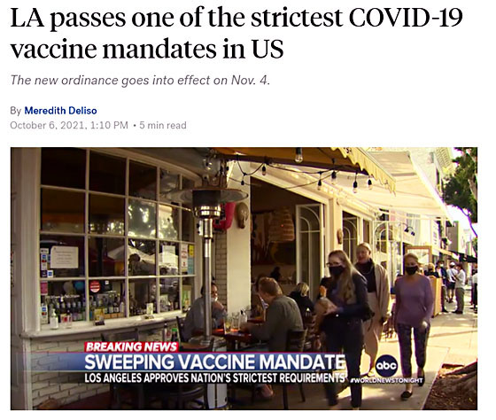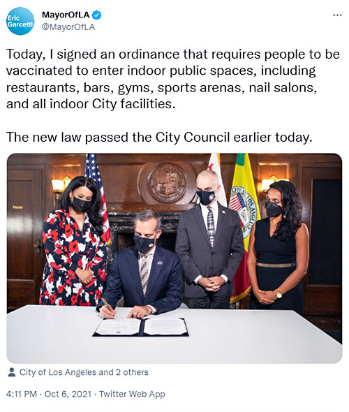 昨日10月6日、アメリカ国内で最も厳しいとされる「Vaccine Mandates」の1つがロサンゼルス市の市議会により可決され、ロサンゼルス市長が署名しました。