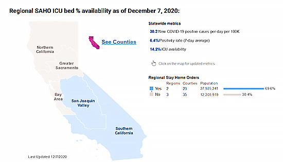 COVID19.CA.GOVのWebsiteによれば、12月7日更新時点での集中治療室の空き容量は、サンホアキン・バレーが6.3%、南カリフォルニアは10.9%と深刻です。