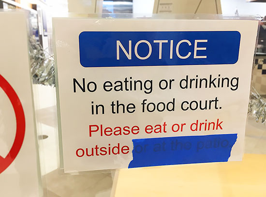 フードコート内に掲示されているNoticeからは、青色のテープで「or at the patio」の部分が消されていました。