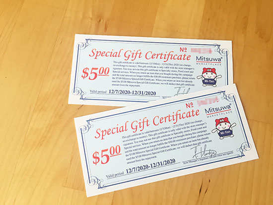 そして今回Mitsuwaで食料品のお買い物をしましたところ、$50のお買い物ごとに$5のギフトカードが頂ける期間中でした! (昨日12月6日で終了)