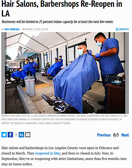 ロサンゼルス・カウンティの美容院、理髪店の屋内営業再開のニュース。