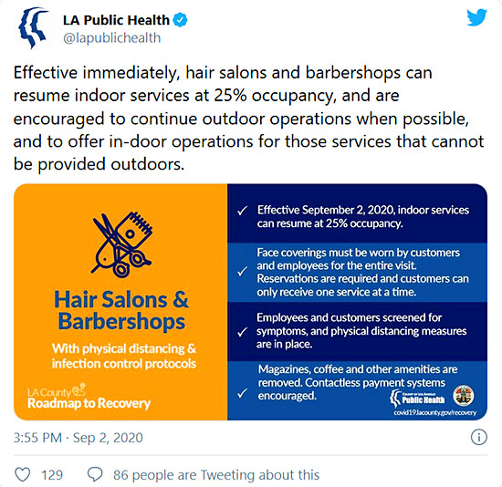 9月2日、Los Angeles County Department of Public Health (ロサンゼルス郡公衆保健局)より、ヘアサロンや理髪店は25%の収容率ですぐに屋内営業が再開出来るとの発表がありました。
