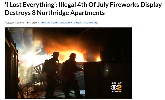 Northridgeで発生した違法花火による住宅火災では、アパート8棟が全焼し5名の居住者が負傷しました…