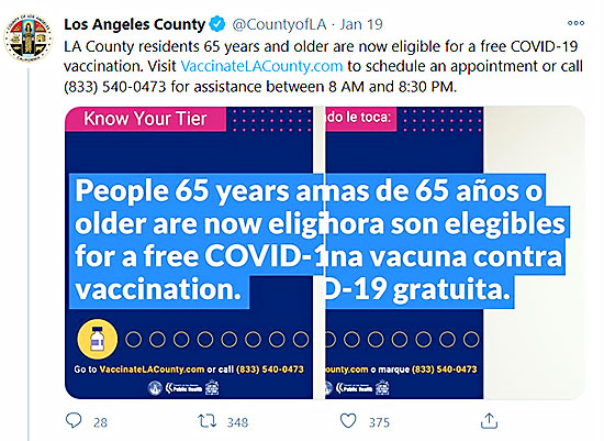 そして大統領就任式の翌日21日より、ロサンゼルス・カウンティでは65歳以上の居住者へのワクチンの供給が開始されました。