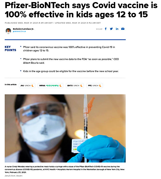 CNBCの記事によれば、Pfizerはドイツの製薬会社BioNTech SEと提携して開発されたCovid-19ワクチンが12歳から15歳の子供に100%効果的で、FDA(アメリカ食品医薬品局)のプロセスが上手く行けば、新学年が始まる秋までに接種に繋がる可能性が高いと述べているそうです。