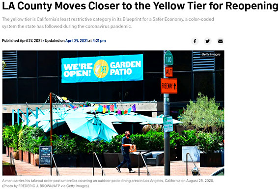 LAカウンティは現在(5月3日現在)も「オレンジ」層に留まっていますが、NBC Los Angelesの記事によれば、先週火曜日(4月27日)に制限が最も低い「イエロー」層へ移行する資格を得るしきい値に達したとの事です。
