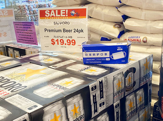 入口付近に積まれているビールの上に、マスク未着用の人へ渡すためのマスクが入った箱が置かれていました。