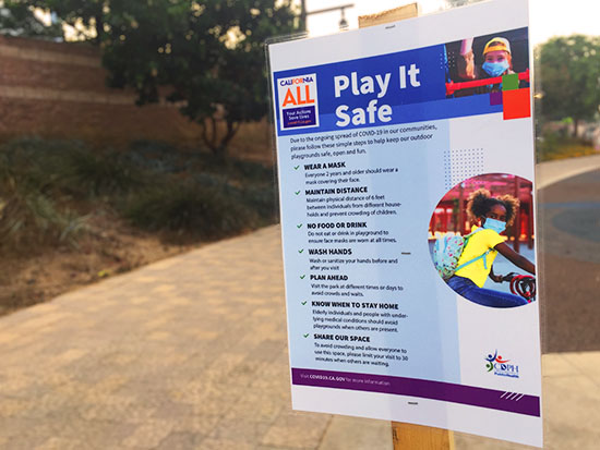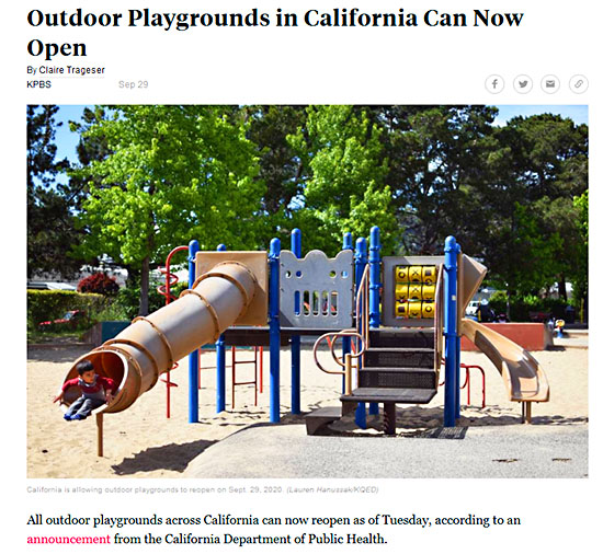 先週火曜日にCalifornia Department of Public Health(カリフォルニア州公衆衛生局)の発表により、州内の全ての公園の屋外遊具などの利用が許可された事を受けての表示だと思われます。