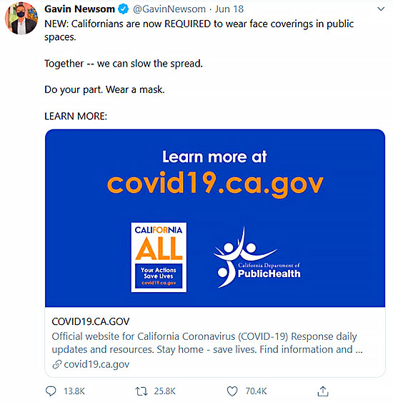 カリフォルニア州知事より6月18日、州全体に対して外出時のマスク着用を義務化する事が発表されました。