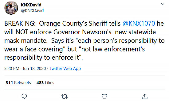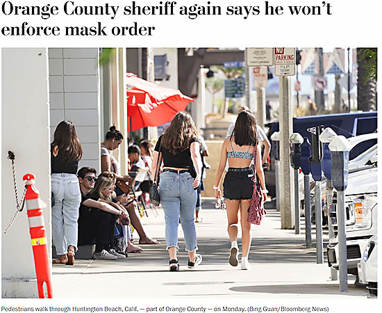 オレンジ・カウンティのSheriff (シェリフ)は、カリフォルニア州のマスク着用義務化に対して「マスク着用は個人の責任であって、私達は強制はしない」としています。