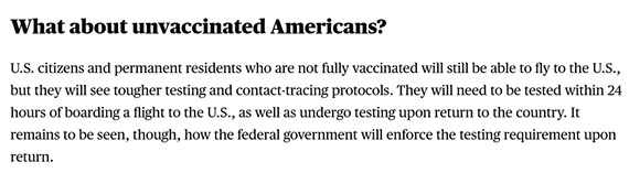 これについてCBS NEWSの記事では、米国市民と米国永住者においてはワクチン接種を終えていなくても再入国が可能である事が記載されています。