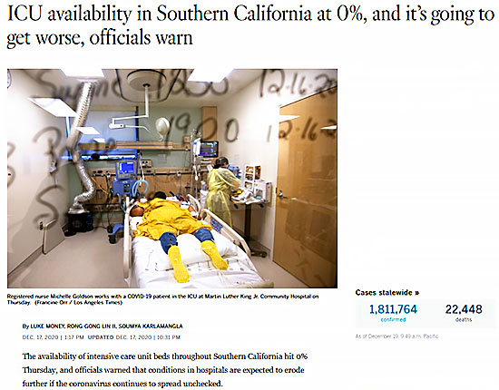 なお南カリフォルニアの集中治療室の空き容量は木曜日に0%に達しており、COVID19.CA.GOVのWebsiteでは本日12月19日更新時点においても0%と示されています。