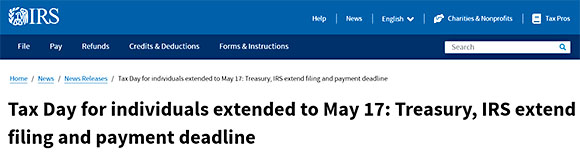 ですが申告を終えた後、IRS(アメリカ国税庁)のWebsiteで、パンデミックの影響による厳しい状況を受け申告期限が5月17日までに延長となっていた事を知りました。